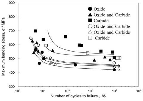 Ti-Ni合金細線を用いた回転曲げ疲労試験の結果(図中の表記は試料に内在する介在物相を示す)