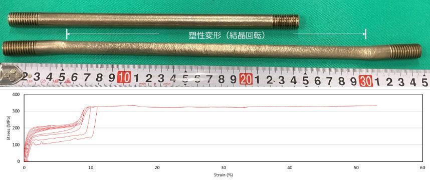 また建物の一部を超弾性部材にすることで,地震時に超弾性部材だけが変形し建物全体の損傷を最小限にすることが可能になりますが,キャマロイと他の部材とを繋ぐ方法が必要になります.キャマロイ特有の単結晶化焼入れ時の低い規則度から,時効処理により規則度を上げ良好な超弾性になる現象に着目し,一般的には難しいと考えられる超弾性材の転造ねじ加工の開発に成功しました.転造ねじは表面に強い圧縮応力を付与させることで高い強度も持つため,写真のように両端に転造ねじを配置したキャマロイ部材をひずみ50%以上の変形を与えても破断せず,しかも低コストで加工が出来るため実用的な接合技術と考えられます.